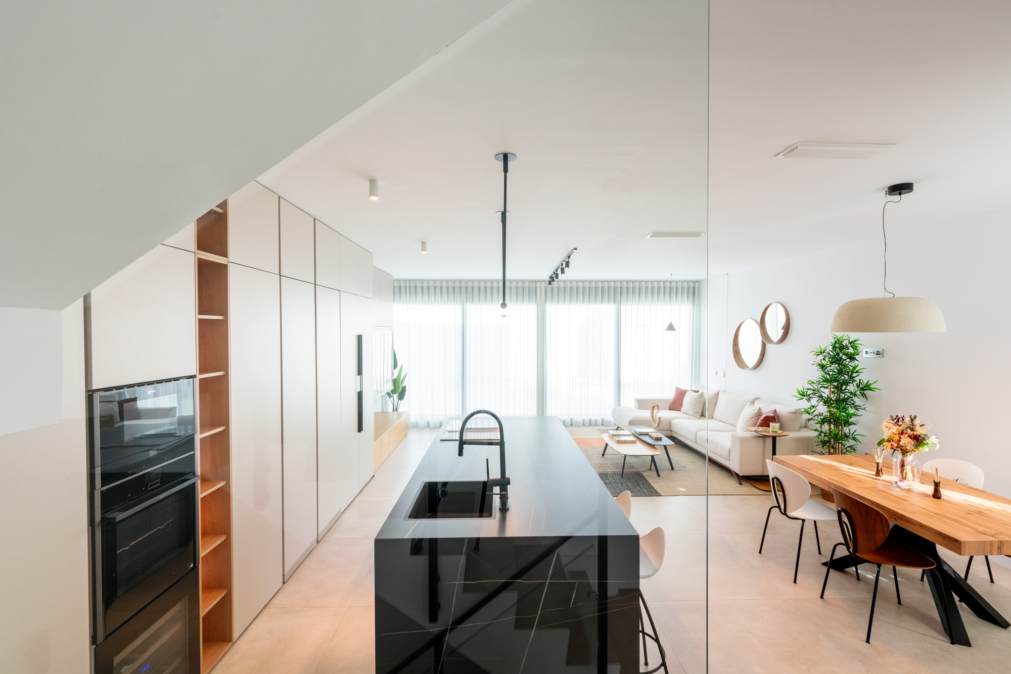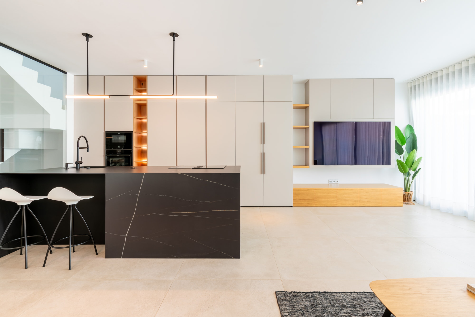 Se plantea un concepto abierto, donde la cocina se integra perfectamente con la zona de salón. El mueble de TV actúa como pieza clave del diseño: se extiende visualmente hacia la cocina, generando un efecto de continuidad que aporta amplitud y coherencia estética.