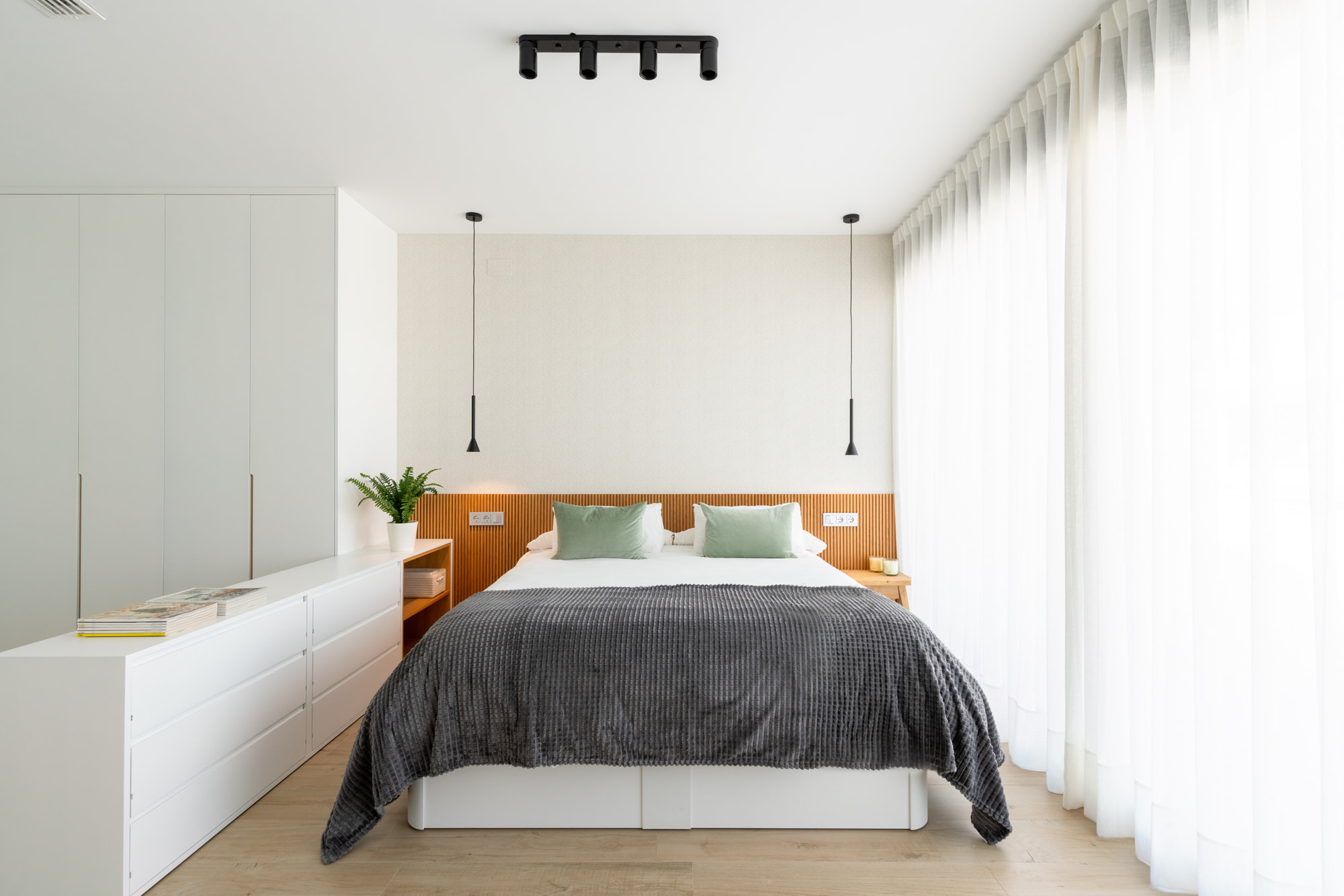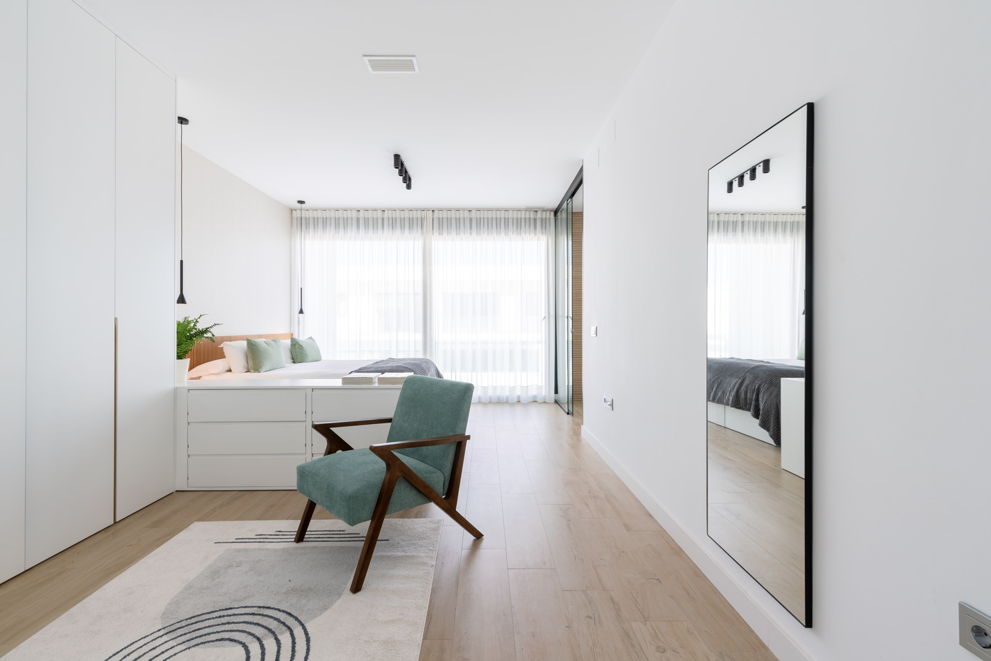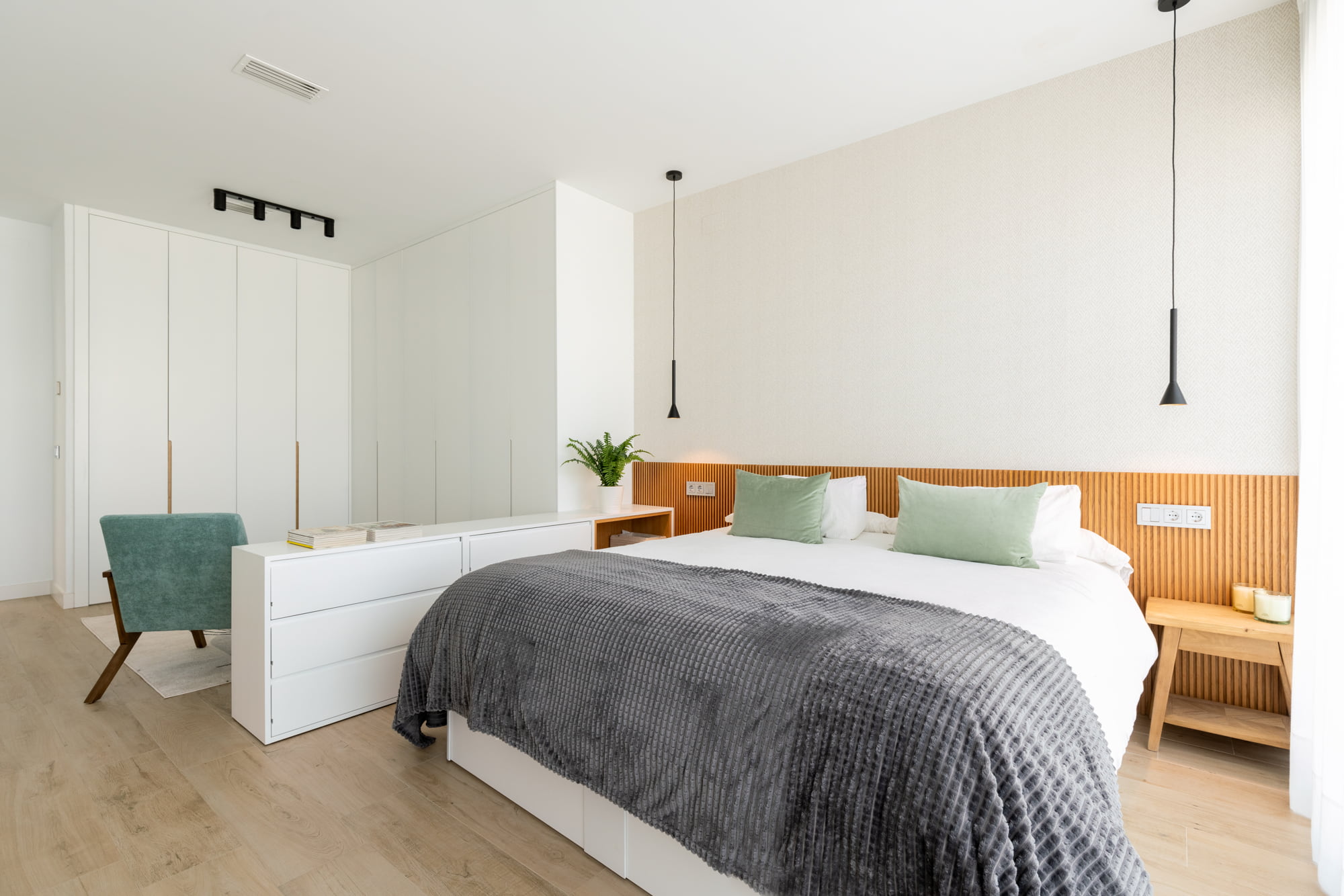 El dormitorio se divide en dos áreas diferenciadas: la zona de vestidor y la zona de descanso. Para delimitar estos espacios, utilizamos cómodas de doble acceso, que funcionan como elementos divisorios prácticos y estéticos.