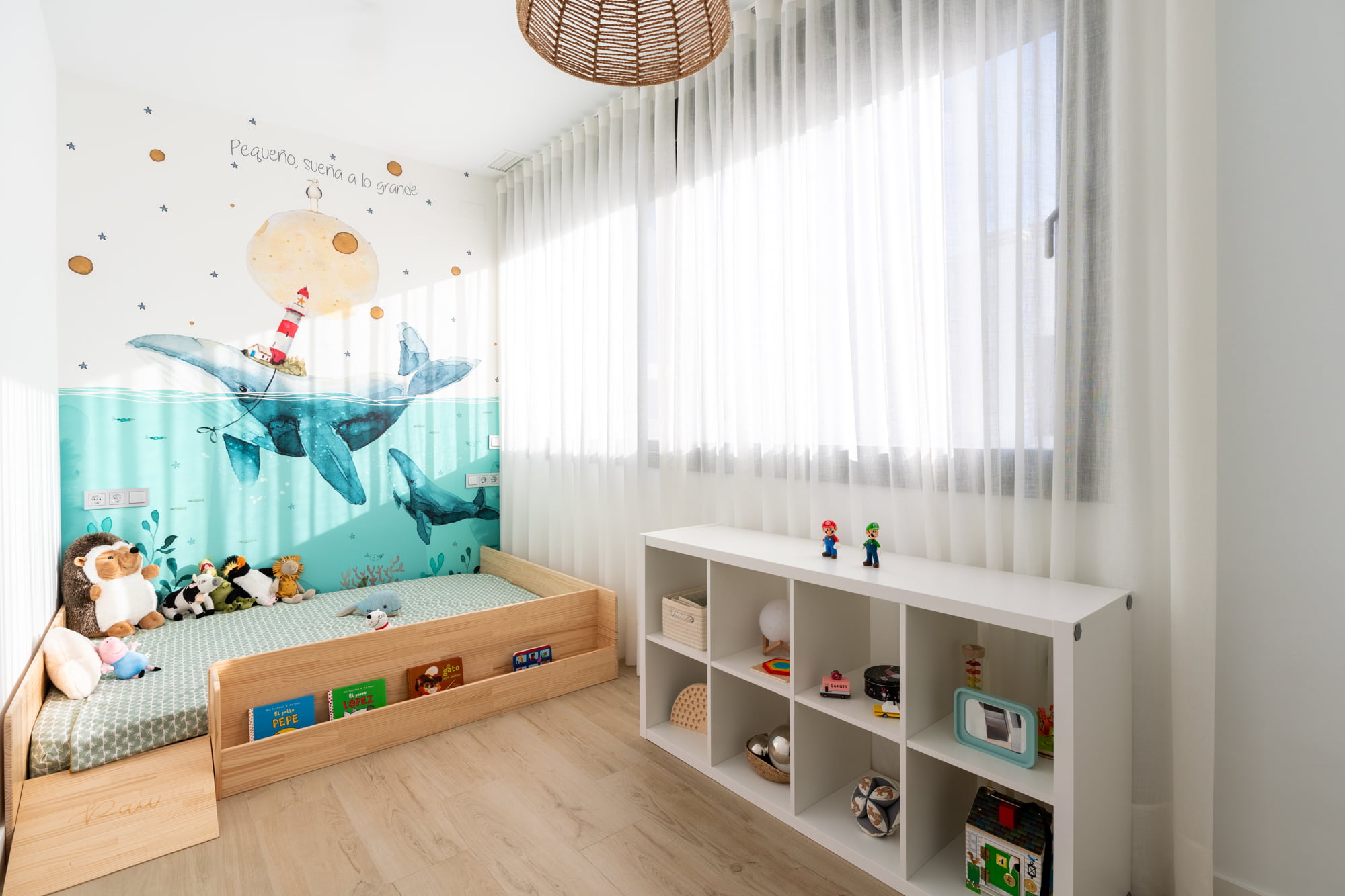 La zona de estar se viste con colores neutros y serenos, seleccionados cuidadosamente para potenciar la sensación de paz y confort. En esta misma planta, también diseñamos un dormitorio de juegos, pensado para que los más pequeños disfruten, jueguen y se expresen libremente en un entorno funcional y acogedor.